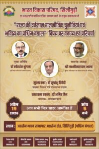 प्रस्तावना वक्तव्य डॉ अमित जैन संपादक चाणक्य वार्ता मंच पर होंगे। कार्यक्रम की तैयारी को अंतिम रूपादे दिया गया है। भारत विकास परिषद के अध्यक्ष कैलाश कंदोई, सचिव मीना देवी अग्रवाल सचिव, कार्यक्रम जनसंपर्क संयोजक, विनोद अग्रवाल (बिन्नू),जनसंपर्क सहसंयोजक सुशील अग्रवाल,संयोजक मनोज शर्मा , सहसंयोजकसुशील रामपुरिया ने बताया कि बंगाल की राजनीति वर्तमान में एक महत्वपूर्ण मोड़ पर है, जहाँ 2026 के विधानसभा चुनाव राज्य के भविष्य की दिशा तय करने वाले माने जा रहे हैं। राज्य में इस समय सत्ताधारी तृणमूल कांग्रेस (TMC) और मुख्य विपक्षी दल भारतीय जनता पार्टी (BJP) के बीच सीधा और कड़ा मुकाबला देखने को मिल रहा है। राज्य की वर्तमान स्थिति पर सुधांशु त्रिवेदी सहित अन्य गणमान्य का मार्गदर्शन लाभदायक होगा।