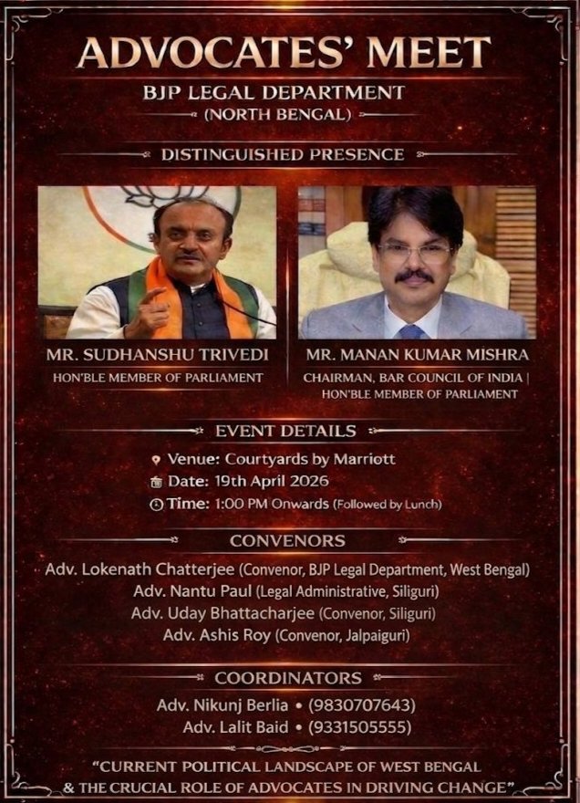 राज्यसभा सांसद एवं बार काउंसिल ऑफ इंडिया के अध्यक्ष मनन कुमार मिश्रा ने पश्चिम बंगाल की कानून-व्यवस्था पर गंभीर सवाल उठाए हैं। उन्होंने कहा कि राज्य में सुरक्षा व्यवस्था पूरी तरह चरमरा गई है और आम लोग खुद को असुरक्षित महसूस कर रहे हैं। इसी बात को लेकर वह कल 19 अप्रैल को मल्लागुड़ी के एक होटल में गहन विचार विमर्श और बैठक करेंगे। इसमें अधिवक्ता लोकनाथ चटर्जी (संयोजक, भाजपा विधि विभाग, पश्चिम बंगाल),सलाहकार . नांटू पॉल (कानूनी प्रशासनिक, सिलीगुड़ी),अधिवक्ता उदय भट्टाचार्य (संयोजक, सिलीगुड़ी) सलाहकार,आशीष रॉय (संयोजक, जलपाईगुड़ी),सलाहकार निकुंज बर्लिया ,अधिवक्ता ललित बैद की उपस्थिति में पश्चिम बंगाल का वर्तमान राजनीतिक परिदृश्य और परिवर्तन लाने में अधिवक्ताओं की महत्वपूर्ण भूमिका पर गहन विचार विमर्श की जाएगी। वहीं दूसरी ओर शाम को भारत विकास परिषद सिलीगुड़ी और अंतरराष्ट्रीय चाणक्य वार्ता के तत्वाधान में सिलीगुड़ी अग्रसेन भवन में 19 अप्रैल की शाम राज्य की वर्तमान राजनीतिक चुनौतियां एवं भविष्य का पश्चिम बंगाल पर परिचर्चा का आयोजन किया जाएगा। इस कार्यक्रम में बतौर मुख्य अतिथि डॉ हर्षवर्धन श्रृंगला (पूर्व विदेश सचिव व राज्यसभा सदस्य)