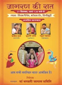 अशोक झा/ सिलीगुड़ी: जिसका पिछले एक वर्ष से माता के भक्त इंतजार कर रहे थे। वह घड़ी आ गई है। कल यानि 27 सितंबर को माता जागरण का पंडाल भक्तों के लिए खुल जाएगा। मां भगवती जागरण समिति के तत्वावधान में शिवम पैलेश, बर्दवान रोड, सिलीगुड़ी में प्रति वर्ष की भांति इस वर्ष भी 22 वें मां भगवती जागरण की रात भक्तिमय में सराबोर होगी। भक्तों के बीच मां के आराधना के लिए अपनी आवाज से मंत्रमुग्ध करने पहुंच रहे है वाराणसी से संजीव शर्मा, भुवनेश्वर से