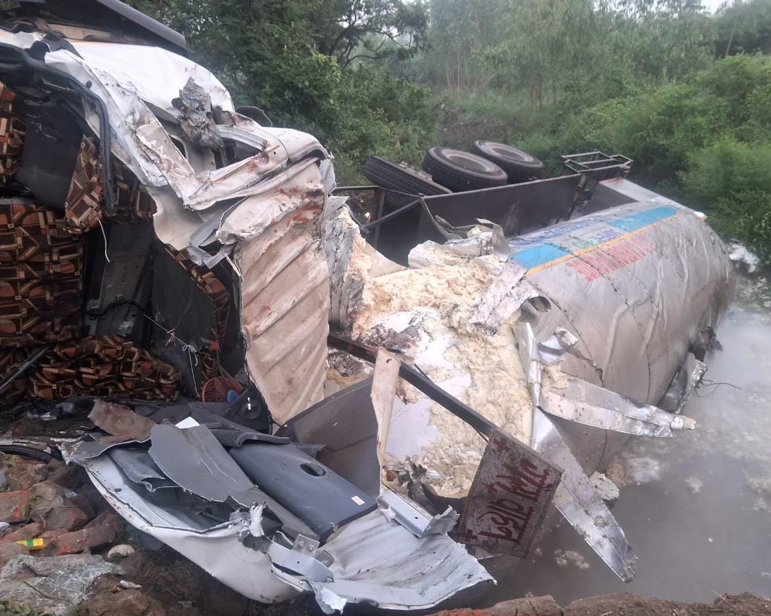 यूपी के बिजनौर जिले में अफ़जलगढ़ के पास एक दर्दनाक हादसा हुआ…* गैस से भरा टेकर पुलिया तोड़ते हुए गिरा। टैंकर अनियंत्रित होकर नदी में जा गिरा, जिससे लाखों रुपए की गैस बाहर आ गई। टेकर काशीपुर से हरिद्वार जा रहा था। गैस से भरा टैंकर को ले जा रहे चालक ओर परिचालक की मौके पर ही दर्दनाक मौत हो गई। मौत की सूचना मिलने परिजनों मचा कोहराम