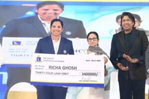 22 साल की ऋचा घोष ने भारतीय महिला टीम को वर्ल्ड कप 2025 की ट्रॉफी जिताने में अहम भूमिका निभाई थी. वर्ल्ड चैंपियन बनने के बाद ऋचा को पश्चिम बंगाल की मुख्यमंत्री ममता बनर्जी ने शनिवार, 8 नवंबर को कोलकाता के ईडन गार्डन्स में आयोजित एक सम्मान समारोह के दौरान ऋचा घोष को DSP की नियुक्ति पत्र सौंपा. इसके अलावा, बंगाल सरकार ने ऋचा को प्रतिष्ठित ‘बंगभूषण’ पुरस्कार से भी सम्मानित किया है. साथ ही मुख्यमंत्री ने उन्हें एक सोने की चेन भी भेंट की.