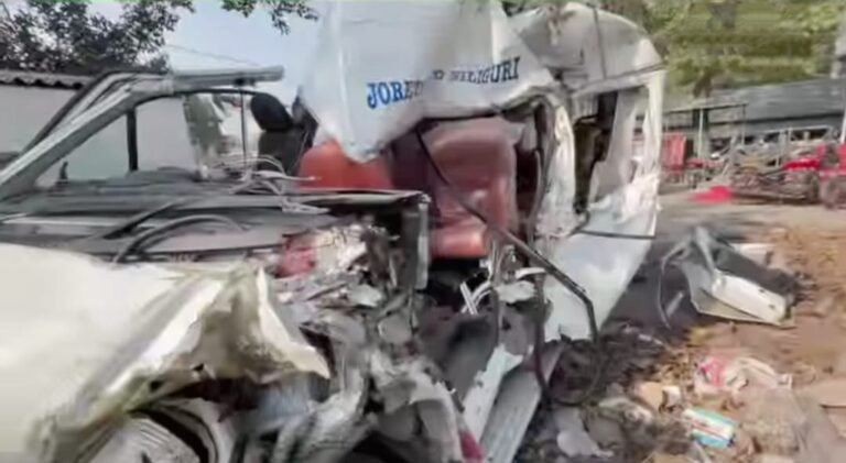 अशोक झा/ सिलीगुड़ी: सिलीगुड़ी में देर रात भयावह सड़क दुर्घटना में तीन लोगों की मौत हो गई है। मृतकों की पहचान ब्रिज मोहन प्रसाद (66), अरुण कुमार गुप्ता (48) और राज कुमार गुप्ता (51) के रूप में हुई है। तीनों वेस्ट सिक्किम के निवासी थे। प्राप्त जानकारी के अनुसार, तीनों एक गाड़ी से सिलीगुड़ी में शादी समारोह में शामिल होने आए थे। शादी के बाद तीनों देर रात सिक्किम लौट रहे थे। जैसे ही उनका गाड़ी बंगाल सफारी से आगे आठ माइल के करीब पहुंचा। उस समय सामने से आ रही एक तेज रफ्तार मालवाही ट्रक ने उनकी गाड़ी को जोरदार टक्कर मार दी। टक्कर इतनी भीषण थी कि कार के परखच्चे उड़ गए। घटना में तीनों लोग गंभीर रूप से घायल हो गए। घटना की जानकारी मिलते ही भक्ति नगर थाना की पुलिस मौके पर पहुंची और घायलों को बरामद कर सेवक रोड स्थित एक निजी अस्पताल में भर्ती कराया। जहां तीनों की मौत हो गई। घटना के बाद रविवार सुबह सिलीगुड़ी मेट्रोपॉलिटन पुलिस के ट्रैफिक डीसीपी काजी शमसुद्दीन अहमद ने घटनास्थल के निरीक्षण पर पहुंचे। पुलिस पूरे मामले की जांच में जुट गई है।