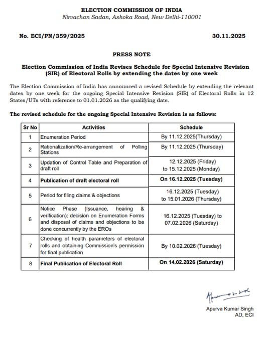 SIR की समय सीमा बढ़ाई गई। सभी 12 राज्यों के लिए समय सीमा 7 दिन बढ़ाई गई!