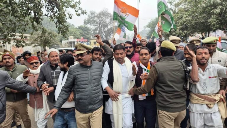 उप्र बस्ती जिले में गुरूवार को प्रदेश नेतृत्व के आवाहन पर कांग्रेस नेताओं, कार्यकर्ताओं ने कांग्रेस जिलाध्यक्ष विश्वनाथ चौधरी के नेतृत्व में उग्र प्रदर्शन किया। कडाके की ठंड, शीतलहर के बीच कांग्रेस नेता शास्त्री चौक पर एकत्र हुये और भारतीय जनता पार्टी कार्यालय घेर कर प्रदर्शन करने के उद्देश्य से सरकार विरोधी नारा लगाते हुये आगे बढे। भारी पुलिस बल ने कांग्रेस नेताओं को शास्त्री चौक पर ही रोक लेने का प्रयास किया किन्तु कांग्रेस नेता दीवानी कचहरी गेट के निकट तक पहुंचे जहां से उन्हें भारतीय जनता पार्टी कार्यालय तक नहीं जाने दिया गया। कांग्रेस जिलाध्यक्ष विश्वनाथ चौधरी ने कहा कि भारतीय जनता पार्टी ई.डी., सीबीआई जैसी संस्थाओं का दुरूपयोग कर लोकतंत्र को तानाशाही की ओर ले जा रही है किन्तु कांग्रेस इसे पूरा नहीं होने देगी। कहा कि पार्टी के राष्ट्रीय अध्यक्ष मल्किलार्जुन खरगे, नेता प्रतिपक्ष राहुल गांधी के साथ ही समूची कांग्रेस वोट चोर गद्दी-छोड़, ई.डी., सीबीआई के दुरूपयोंग का संदेश गांव- गांव तक पहुंचा रही है। नेशनल हेरल्ड मामले में जिस प्रकार से श्रीमती सोनिया गांधी, राहुल गांधी के साथ ही अनेक नेताओं को फर्जी मनगढन्त मामलों में फंसाने का दुष्चक्र रचा गया। आदलत के आदेश ने सिद्ध कर दिया है कि सत्य परेशान हो सकता है, पराजित नहीं।पूर्व विधायक अम्बिका सिंह, ज्ञानेन्द्र पाण्डेय ‘ज्ञानू’, अनिल भारती, डा. वाहिद अली सिद्दीकी, शौकत अली नन्हू, संदीप श्रीवास्तव, अलीम अख्तर, डा. आलोक रंजन, बाबूराम सिंह, नर्वदेश्वर शुक्ल, लक्ष्मी यादव, डा. शीला शर्मा आदि ने कहा कि भाजपा देश के संस्थानों पर कब्जा जमाकर लोकतंत्र का गला घोट रही है। कहा कि नेशनल हेरल्ड मामले में जिस प्रकार से फैसला आया है उससे सिद्ध हो चुका है कि सरकार कांग्रेस और विपक्षी दलों के नेताओं को फर्जी मामलों में फंसा रही है। कहा कि देश की जनता परेशान है, डालर के मुकाबले रूपया लगातार गिर रहा है किन्तु भाजपा उपलब्धियों का ढोल पीट रही है। जनता अब सब समझ चुकी है। भाजपा के मंसूबे कभी पूरे नहीं होंगे। वोट चोर गद्दी-छोड़, ईडी, सीबीआई के दुरूपयोग आदि मुद्दों को लेकर कांग्रेस द्वारा किये गये आन्दोलन में मुख्य रूप से गिरजेश पाल, रामधीरज चौधरी, अमर बहादुर शुक्ल, शेर मोहम्मद, सुधीर यादव, आलोक तिवारी, दूधनाथ पटेल, रविन्द्र सिंह, डीएन शास्त्री, राहुल चौधरी, राम बचन भारती, अतीउल्ला सिद्दीकी चन्द्रशेखर वर्मा, विनय तिवारी, अनूप पाठक, सलाहुद्दीन, के साथ ही बड़ी संख्या में कांग्रेस के पदाधिकारी, कार्यकर्ता शामिल रहे।