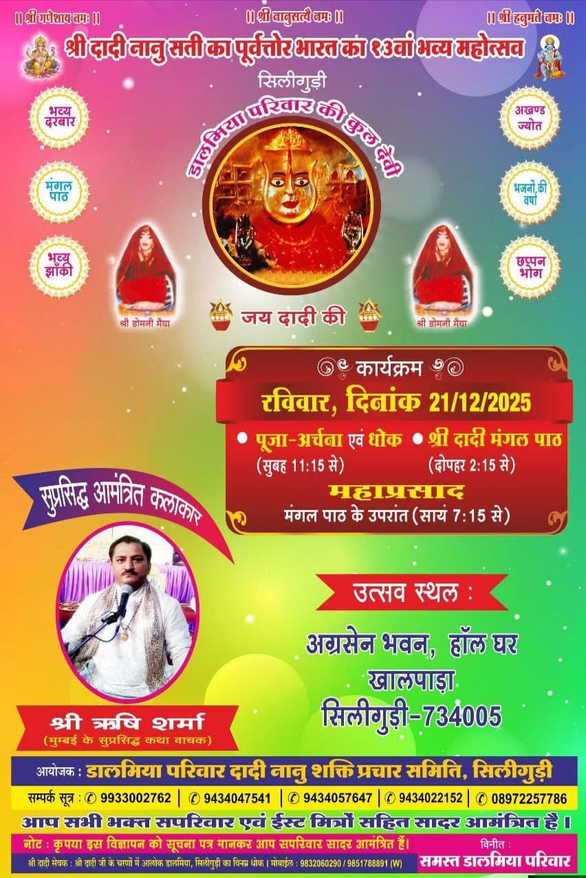 अशोक झा/सिलीगुड़ी: डालमिया परिवार की कुलदेवी नानू सती का सप्तम महोत्सव आज रविवार को मंगलपाठ, भव्य दरबार, भव्य झांकी, नृत्य नाटिका, भजन संध्या और छप्पन भोग के साथ रविवार 21 दिसंबर को संपन्न होगा। इसकी तैयारी जोरशोर से की जा रही है। डालमिया परिवार की ओर से सीताराम डालमिया ने बताया कि रविवार का दिन जीवन में उत्सव का दिन होगा। क्योंकि मेरी माँ नानू सती माता,मेरी माँ सुहासड़ा वाली है। ढोलक में लाल छुपाकर माँ,डोमिनी ने की रखवाली है।